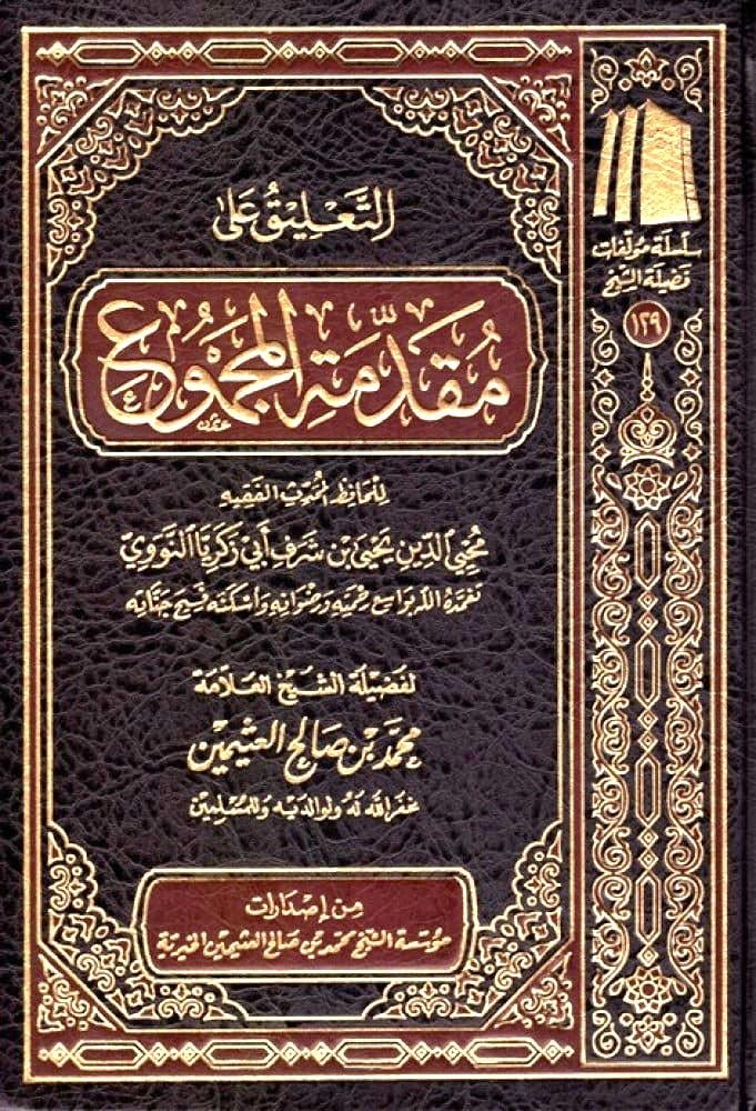 فهذه مقدمة الإمام النووي – رحمه الله – لكتاب المجموع الذي شرح فيه كتاب المهذب للإمام الشيرازي – رحه الله -، والمتوفى سنة ٤٧٦ هجرية. وهذه المقدمة قد حوت دررا من قواعد العلم وضوابطه فهذه المقدمة، قد تناول فيها مؤلفها عليه رحمة الله تعالى مسائل علمية جليلة، ومنها بيان فضل العلم وبيان أقسامه بيان مدى أهمية عنصر الإخلاص والصدق في تحصيل العلم وتعليمه آداب العالم وآداب المعلم وآداب المتعلم وغير ذلك وقد قام الشيخ محمد بن صالح العثيمين بشرح وتعليق هذه المقدمة النافعة