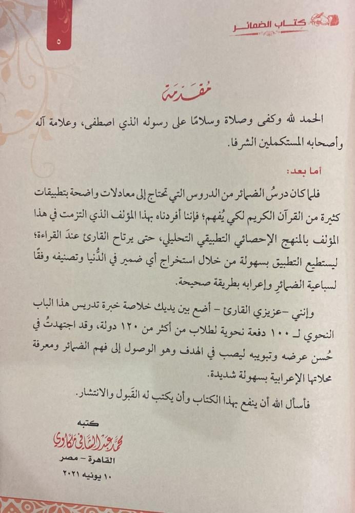 وإنني -عزيزي القارئ - أضع بين يديك خلاصة خبرة تدريس هذا الباب النحوي لـ ١٠٠ دفعة نحوية لطلاب من أكثر من ۱۲۰ دولة، وقد اجتهدت في حُسن عرضه وتبويبه ليصب في الهدف وهو الوصول إلى فهم الضمائر ومعرفة محلاتها الإعرابية بسهولة شديدة.
