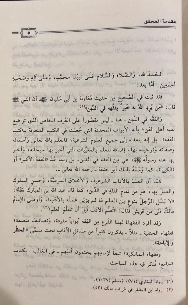 كما أن العلم بالآداب الشرعية والأخلاق المرعيَّة، وحسن السلوك تمال در امال والعمل بها هو من تمامِ الفقه في الدين؛ كما قال عبد الله المبارك ر الله : لا يَنبُل الرَّجلُ بنوع من العلم ما لم يزيّن عَمَلَهِ بالأدب»، وَأوصى الإمامُ مالك فتى من قريش فقال: «تعلم الأدب قبل أن تتعلم العلم (٢).