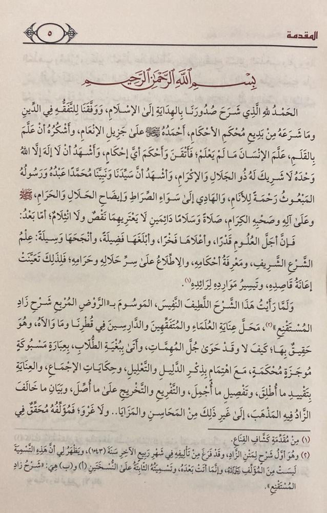 وَلَمَّا رَأَيْتُ هَذَا الشَّرْحَ اللَّطِيفَ النَّفِيسَ المَوسُومَ بـ الرَّوْضِ المُرْبِعِ شَرْحِ زَادِ المُسْتَقْنِعِ ، مَحَلَّ عِنَايَةِ العُلَمَاءِ والمُتَفَقِّهِينَ والدَّارِسِينَ فِي قُطْرِنَا وَمَا وَالاهُ، وَهُوَ حَقِيقُ بِهَا كَيْفَ لا وقَدْ حَوَى جُلَّ المُهِمَّاتِ، وَأَتَى بِبُغْيَةِ الطُّلابِ، بِعِبَارَةٍ مَسْبُوكَةٍ مُوجَزَةٍ مُحْكَمَةٍ، مَعَ اهْتِمَامِ بِذِكْرِ الدَّلِيلِ والتَّعْلِيلِ، وحِكَايَاتِ الإِجْمَاعِ، والعِنَايَةِ بتقييد ما أُطلِقَ وتَفْصِيلِ ما أُجْمِلَ والتَّفْرِيعِ والتَّخْرِيحِ عَلَىٰ مَا أُصْلَ، وَبَيَانِ مَا خَالَفَ الزَّادُ فِيهِ المَذْهَبَ إِلَى غَيْرِ ذَلِكَ مِنْ المَحَاسِنِ والمَزَايَا .. وَلَا غَرْوَ؛ فَمُؤَلِّفُهُ مُحَقِّقٌ فِي المَذْهَبِ ومُحَرِّرٌ ، وعَلَيهِ المُعَوَّلُ عِنْدَ المُتَأَخْرِينَ فِي إِيضَاحِ مَسَائِلِ المَذْهَبِ وَتَقْرِيرِها. أقُولُ : لَمَّا رَأَيْتُهُ بِهَذِهِ المَكَانَةِ والمَنْزِلَةِ، تاقَتْ نَفْسِي إِلَى الْعَمَلِ عَلَى خِدْمَتِهِ عَلَى نَحْوِ يَلِيقُ بِهِ؛ فَشَمَّرْتُ عَنْ سَاعِدِ الجِدٌ ) ، مُسْتَعِينَ بِاللَّهِ عَنَاكَ فِي بُلُوغَ القَصْدِ، رَاغِبًا إِلَيهِ فِي حُصُولِ القَبُولِ والنَّفْعِ.